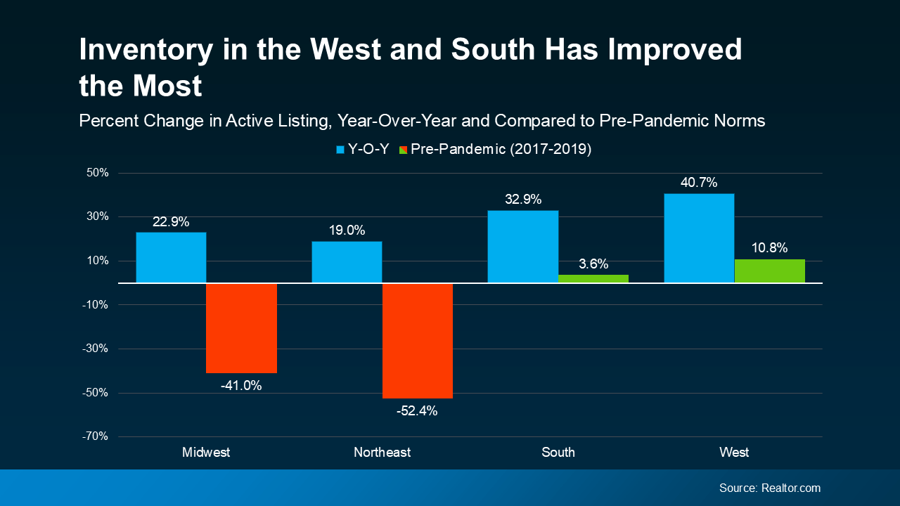 Nationally, the number of homes for sale is rising – and that’s true in all regions of the country. That’s shown in this data from Realtor.com. In each of the four regions, inventory is up at least 19% compared to the same time last year. In the West, it’s actually up almost 41% year-over-year ( see graph below ):